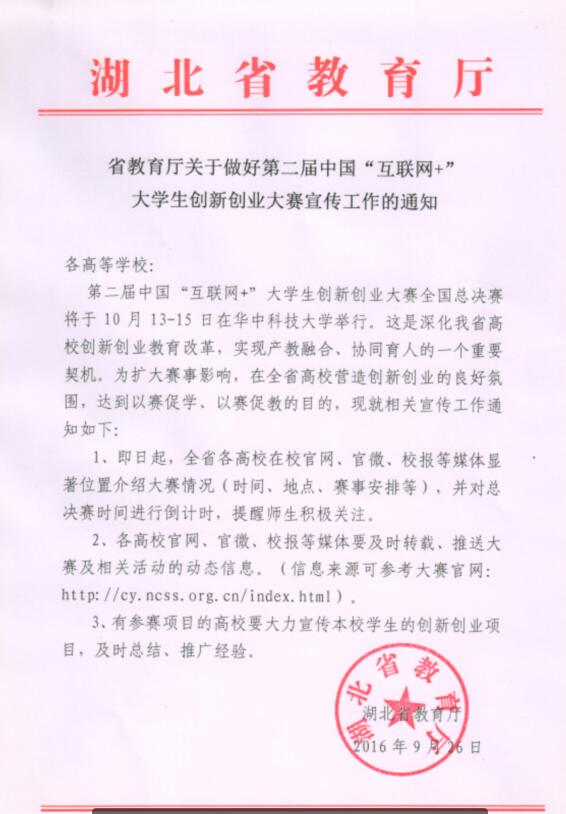 第二届中国“互联网+”大学生创新创业大赛全国总决赛将于10月13-15日在华中科技大学举行。这是深化我省高校创新创业教育改革,实现产教融合、协同育人的一个重要契机。为扩大赛事影响,在全省高校营造创新创业的良好氛围,达到以赛促学、以赛促教的目的,现就相关宣传工作通知如下: