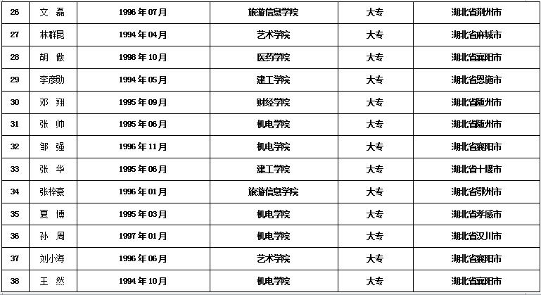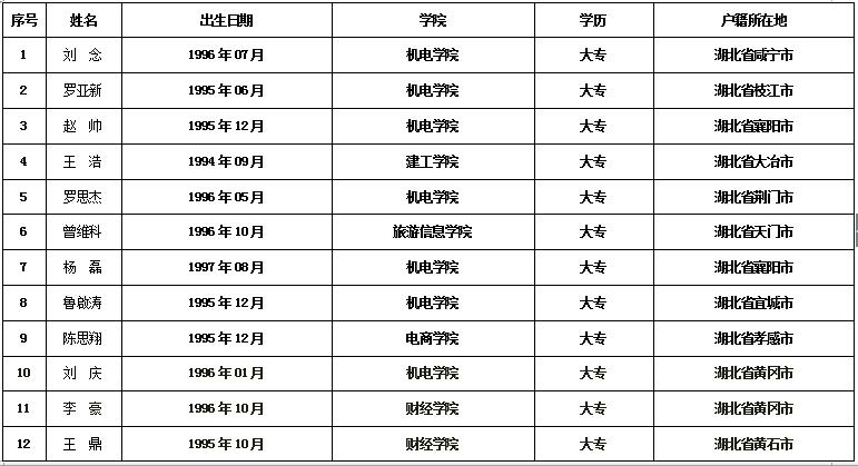 根据2016年夏秋季征兵工作计划,beat365官网预征兵为95人。在武装部组织体检、复检、政治考核的基础上,经洪山区征兵工作领导小组集体研究决定,beat365官网今年预定兵合格人数确定为51人。为确保兵员征集质量,现向社会各界公示,接受群众监督,具体人员名单如下: